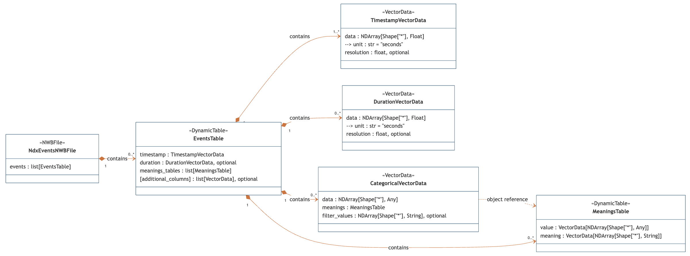 Event data are extremely common in neurophysiology experiments; however, before NWBEP001 was merged into the core NWB schema, there were no dedicated neurodata types for storing event data in NWB. Data curators were using overly generic or overly complex neurodata types to store event data and used multiple different approaches. NWBEP001 proposed adding a standardized, unified, and simple approach for storing event data in NWB. The NWBEP001 Review Working Group (Josh Siegle, Kay Robbins, Chris Rodgers, Alessandra Trapani), as well as the NWB Technical Advisory Board, reviewed NWBEP001 here and approved the proposal in December 2024.